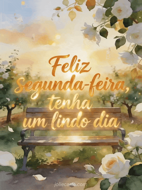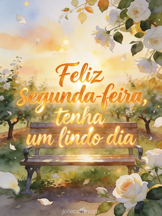Envie uma saudação otimista de segunda-feira com letras âmbar em aquarela, um banco em um pomar radiante, céu luminoso e pétalas de rosa branca saindo da borda. Você também pode compartilhar feliz segunda-feira beijos imagens bonitas, uma feliz segunda-feira citação imagem ou uma feliz segunda-feira na chuva imagem.