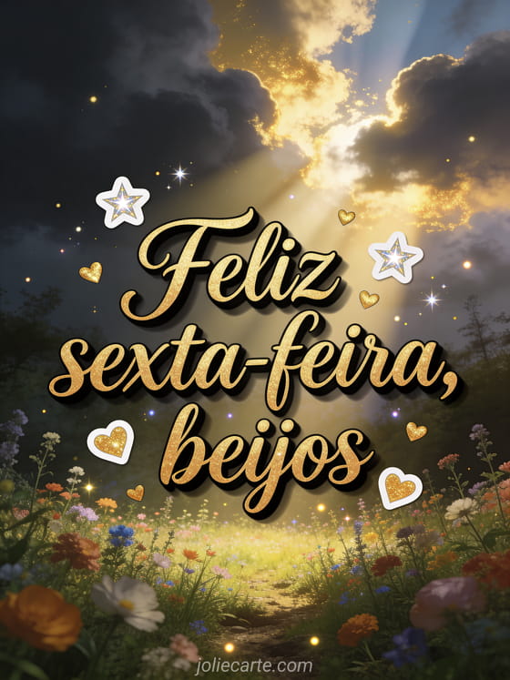 Envie um cartão terno de feliz sexta-feira, beijos com caligrafia dourada, estrelas brilhantes, pequenos corações e uma campina florida iluminada por raios dourados que se abrem entre as nuvens. Veja também frase de bom dia sexta-feira, feliz sexta-feira imagens gratuitas ou mensagem para desejar boa sexta-feira.