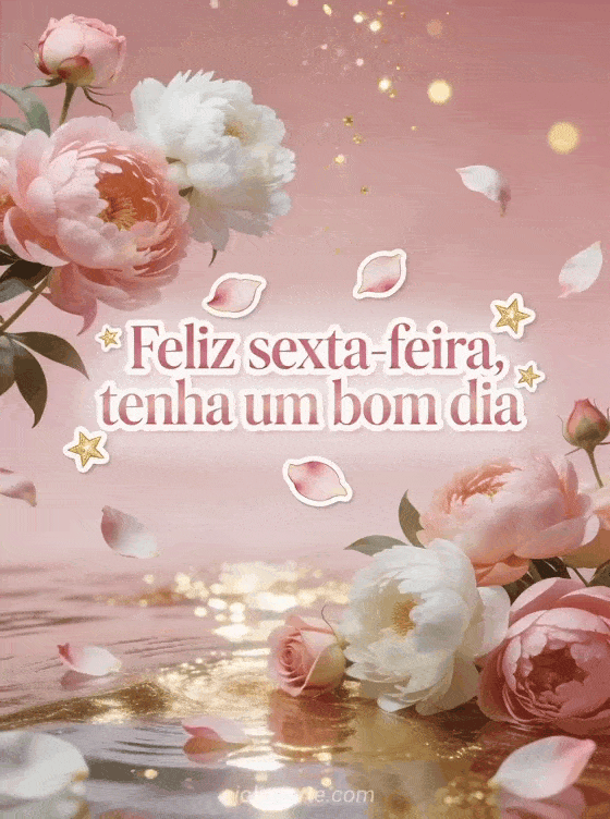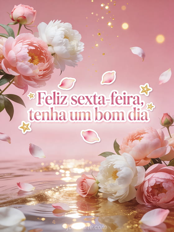 Compartilhe uma mensagem suave de feliz sexta-feira com peônias, pétalas de rosa, estrelas douradas e um desejo carinhoso para um dia bonito. Veja também um bom dia excelente dia de sexta-feira, uma linda imagem de feliz sexta-feira ou um boa sexta-feira sol gif.