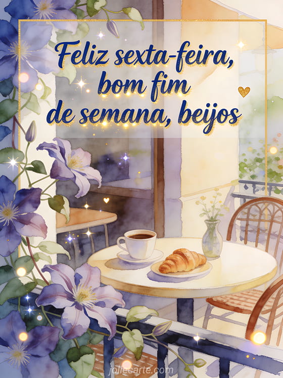 Compartilhe uma mensagem calorosa de sexta-feira e fim de semana com flores de clematite, uma mesa de café ao ar livre, uma xícara de café, croissant e um pequeno vaso em aquarela. Veja também imagens grátis bom fim de semana beijos, feliz fim de semana beijos gifs ou tenha um bom fim de semana beijos.