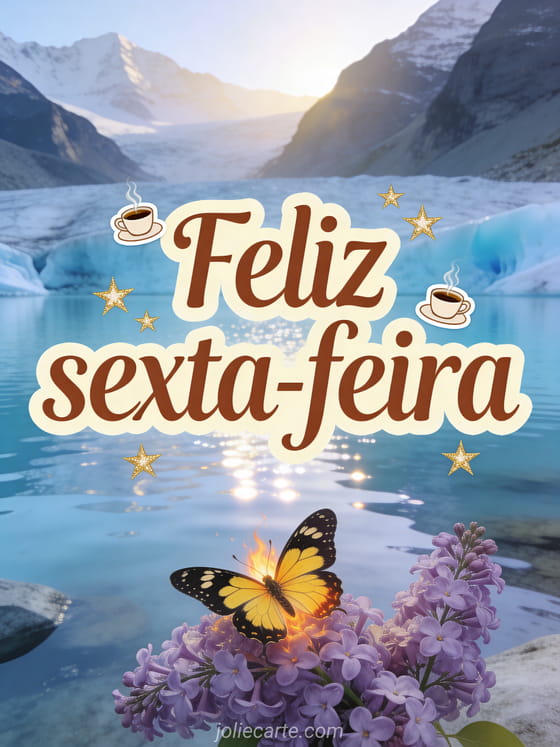 Compartilhe um cartão refinado de feliz sexta-feira com letras calorosas cor de café, reflexos de creme, pequenas xícaras fumegantes, estrelas douradas, um lago glacial azul leitoso, montanhas ao redor e uma borboleta podalírio amarela e preta pousada sobre um buquê de lilás roxo. Veja também mensagem para desejar feliz sexta-feira aos muçulmanos, feliz sexta-feira gatinho ou estas bom dia sexta-feira imagens.