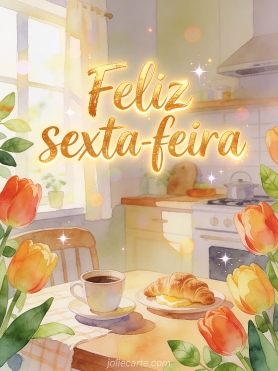 Envie uma mensagem alegre de feliz sexta-feira com tulipas brilhantes, folhas frescas, uma xícara de café e croissants amanteigados em uma mesa aconchegante em uma cozinha ensolarada. Veja também texto para desejar uma feliz sexta-feira, uma feliz sexta-feira borboleta imagem ou feliz sexta-feira imagens animadas.