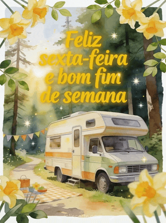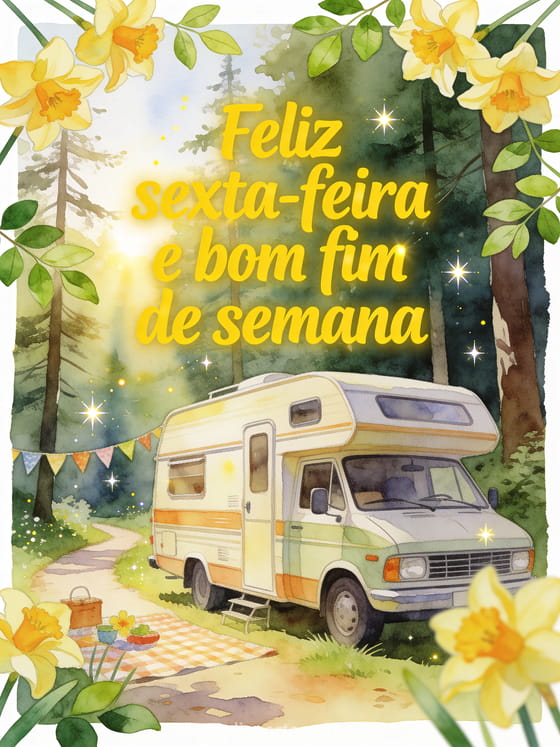 Receba o fim de semana com um trailer retrô em aquarela perto de uma trilha ensolarada na floresta, bandeirinhas de piquenique, narcisos e folhas verdes frescas. Veja também bom dia sexta-feira gif, texto de feliz sexta-feira ou imagem de feliz sexta-feira no fb.