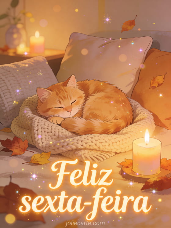 Compartilhe uma saudação calorosa de feliz sexta-feira e bom fim de semana com um gato ruivo fofo enrolado em uma manta de tricô, folhas de outono, luz de velas e almofadas. Veja também uma imagem de feliz sexta-feira beijos, um cartão boa sexta-feira ou um feliz sexta-feira engraçado humor gif.