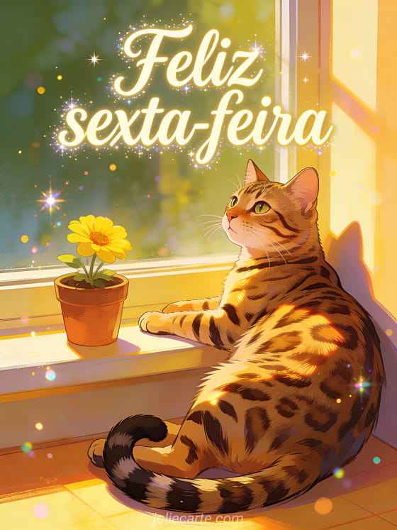 Compartilhe uma imagem de feliz sexta-feira com letras cremosas, brilhos alegres e um gato bengal descansando ao lado de uma janela ensolarada e um pequeno vaso de flores. Você também pode enviar força é sexta-feira, uma boa sexta-feira e bom fim de semana imagem ou um bom dia sexta-feira humor gif.