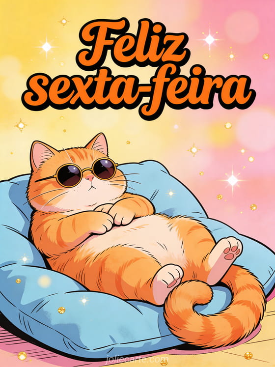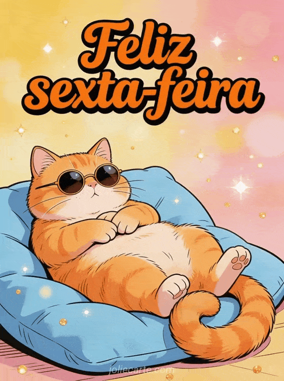 Compartilhe um hilariante cartão de feliz sexta-feira com humor com um adorável gatinho gorducho com óculos de sol. A maneira perfeita de celebrar a chegada do fim de semana. Descubra também um gif feliz sexta-feira humor ou um cartão sexta-feira bom dia.