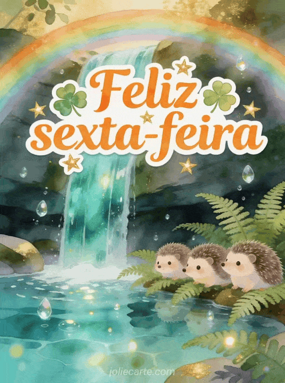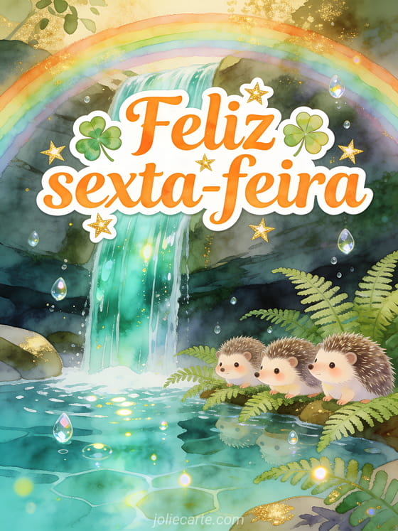 Compartilhe um cartão vivo de feliz sexta-feira com letras laranja em aquarela, trevos da sorte, estrelas douradas, uma cachoeira esmeralda, um arco-íris brilhante e uma família de ouriços fofos entre samambaias junto à água cristalina. Veja também mensagem para desejar boa sexta-feira, feliz sexta-feira muitos beijos ou este bom dia sexta-feira humor.