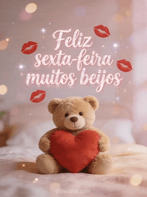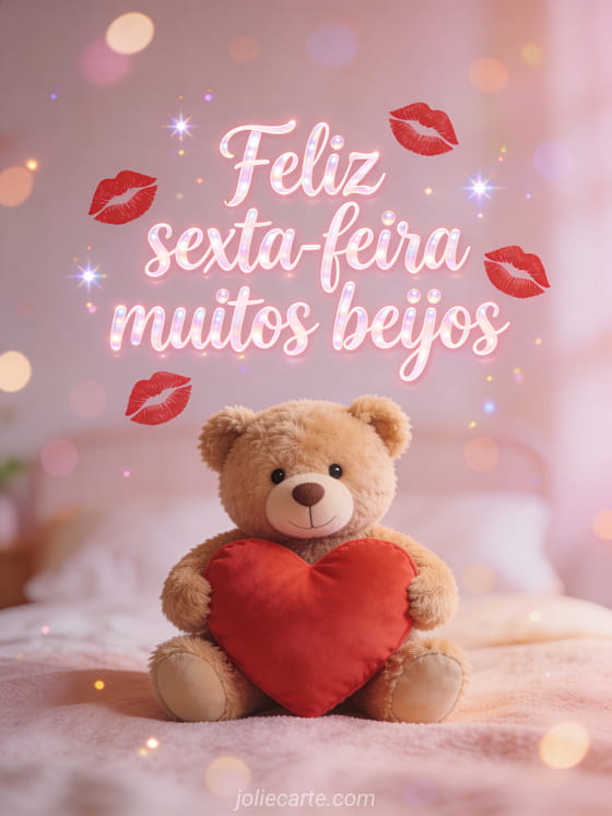 Compartilhe uma saudação terna de feliz sexta-feira com muitos beijos, letras doces, marcas vermelhas de batom e um ursinho de pelúcia segurando uma grande almofada de coração vermelho. Veja também um cartão de bom dia sexta-feira com humor, um bonito cartão de boa sexta-feira ou um cartão de bom dia feliz sexta-feira na praia.