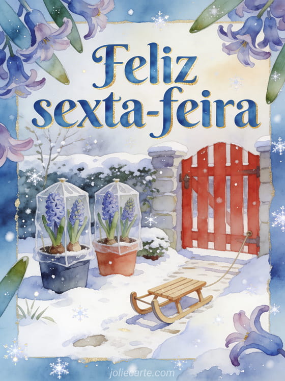 Compartilhe feliz sexta-feira com uma cena acolhedora de neve em aquarela, onde jacintos em vasos protegidos contornam um caminho de jardim ao lado de um pequeno trenó de madeira e um portão vermelho. Você também pode enviar um feliz sexta-feira e bom fim de semana gif, um feliz sexta-feira na chuva gif ou beijos de sexta-feira imagens.