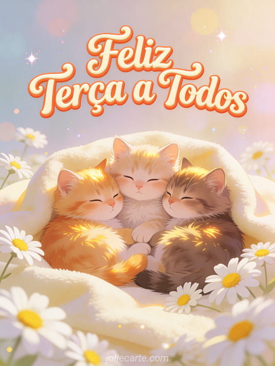 Deseje uma feliz terça-feira a todos com este cartão virtual encantador. Três gatinhos fofos aconchegados em uma manta macia rodeados de margaridas vão aquecer o coração de quem receber. Descubra também um cartão de feliz terça, um cartão de bom dia ou um cartão de feliz terça.