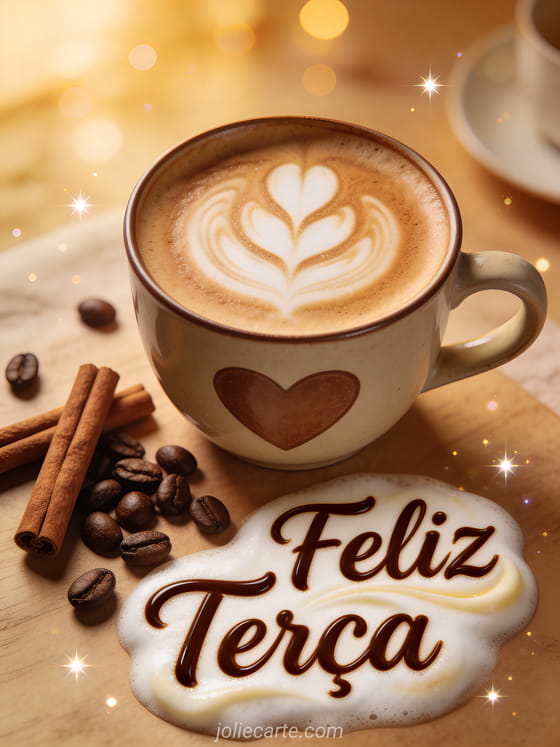 Alegre a terça-feira de alguém com este cartão caloroso com lindo latte art em forma de coração em uma xícara de cerâmica. Descubra também gif feliz terça beijos grátis ou ótima terça beijinhos.