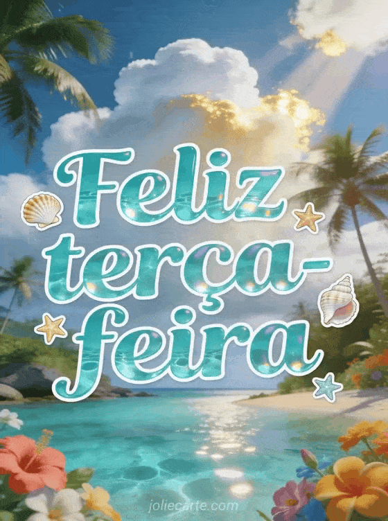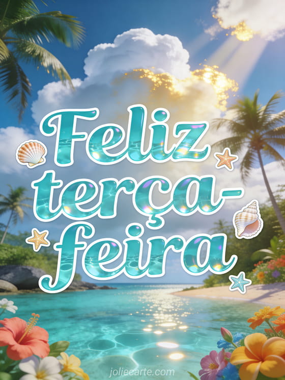 Envie uma saudação luminosa de feliz terça-feira com letras turquesa, stickers de conchas e estrelas-do-mar, uma enseada tropical com água cristalina, palmeiras, flores coloridas e raios dourados entre nuvens brancas. Veja também esta imagem engraçada de feliz terça-feira humor, esta feliz terça-feira imagem ou este bom dia terça-feira cartão.