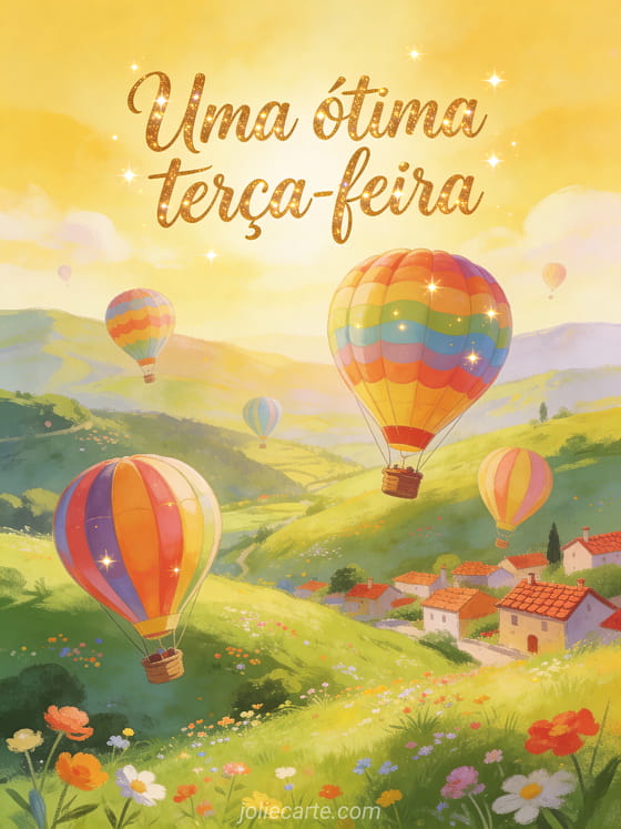 Compartilhe um cartão virtual de feliz terça-feira com caligrafia pintada, balões de ar quente coloridos sobre um vale ensolarado e colinas suaves. Você também pode enviar um feliz terça-feira gif, um terça-feira beijos gif ou uma feliz terça-feira imagem grátis.