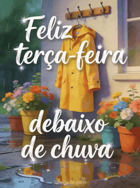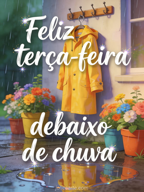 Compartilhe uma imagem de feliz terça-feira com chuva com letras brilhantes, uma capa de chuva luminosa pendurada, vasos com flores coloridas e reflexos de poças. Você também pode enviar feliz terça-feira Facebook imagens, uma feliz terça-feira debaixo de chuva imagem ou feliz terça-feira gifs.