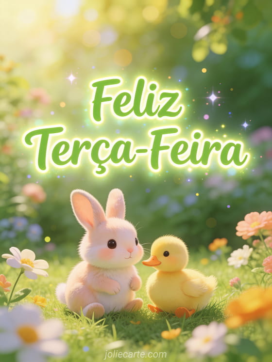 Alegre a terça-feira de alguém com este adorável cartão que apresenta um coelhinho e um patinho sentados juntos na grama macia cercados de flores primaverais. Uma doce cena de amizade animal em um jardim ensolarado. Descubra também um feliz terça-feira ensolarada com café ou uma feliz terça-feira zen imagem.