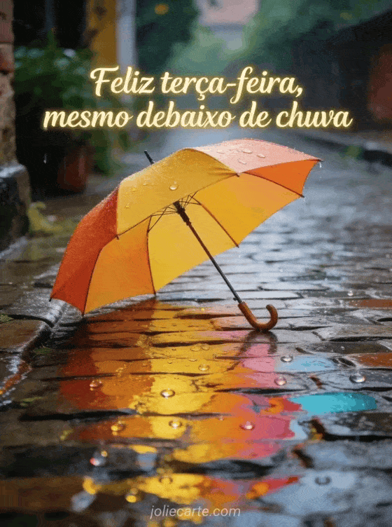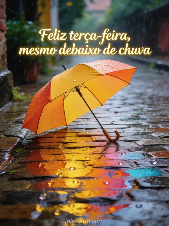 Compartilhe feliz terça-feira debaixo de chuva com texto manuscrito elegante, um guarda-chuva brilhante em um caminho de pedras molhadas e reflexos coloridos. Você também pode enviar um feliz terça-feira borboleta gif, feliz terça-feira imagens grátis ou feliz terça-feira cartões virtuais.