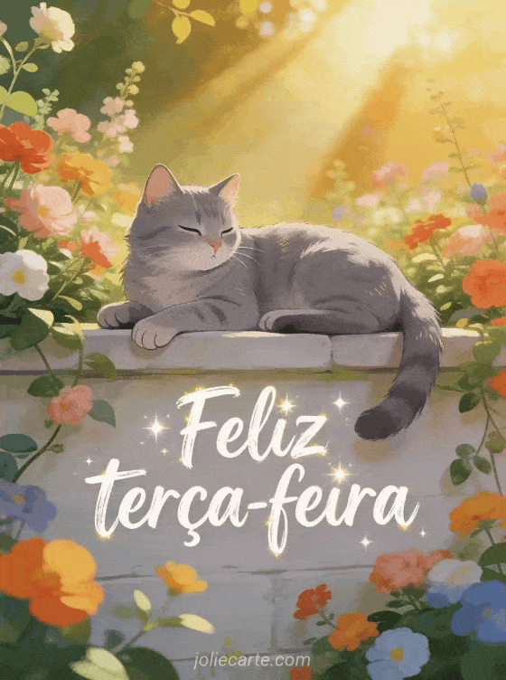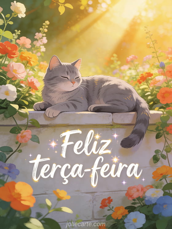 Envie uma saudação calorosa de feliz terça-feira com letras de pincel divertidas, brilhos, um gato cinza descansando em um muro de jardim luminoso, flores vivas e raios dourados da manhã. Veja também esta feliz terça-feira sol imagem, esta feliz terça-feira paisagem imagem ou este bom dia de terça-feira gif.