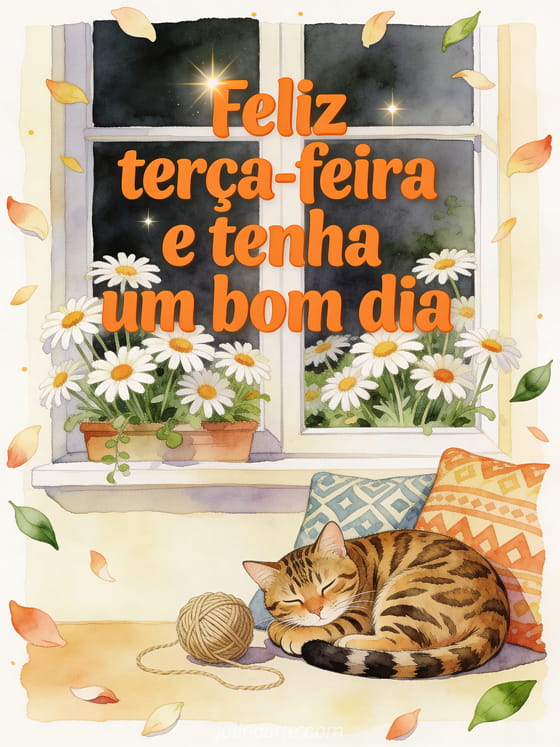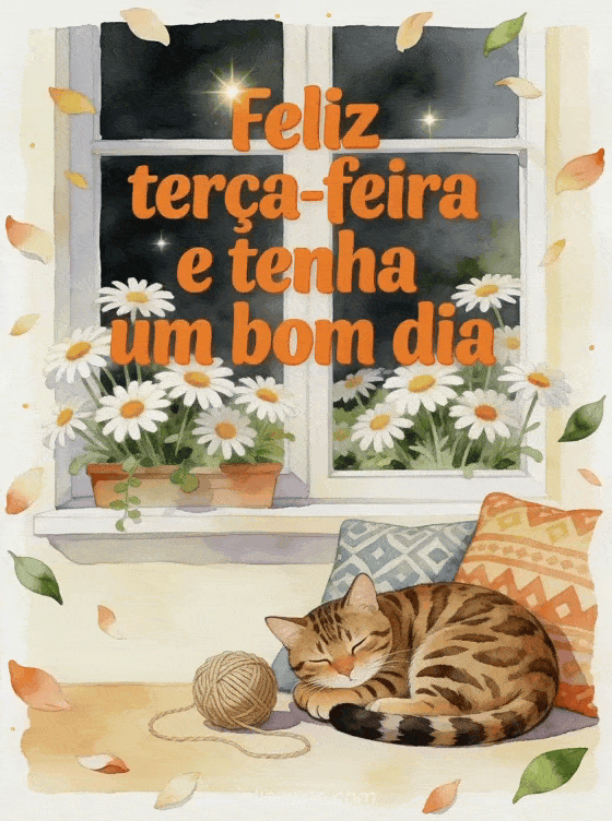 Compartilhe uma mensagem acolhedora de feliz terça-feira com um gato bengal ao lado de uma janela com margaridas, um novelo de lã e almofadas estampadas. Você também pode enviar um gif bom dia e boa terça-feira, feliz terça-feira cartões ou uma feliz terça-feira imagem cintilante.