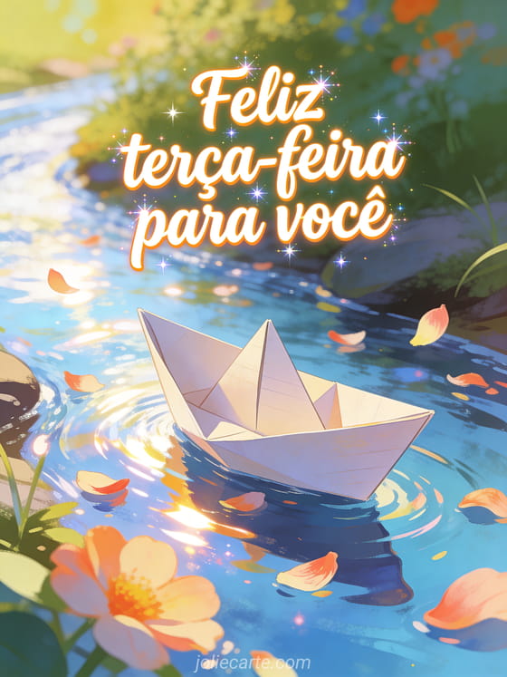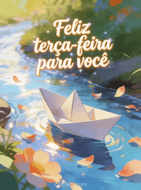 Compartilhe feliz terça-feira com letras alegres, um barco de papel deslizando em um riacho brilhante e pétalas de flores flutuando. Você também pode enviar um feliz terça-feira debaixo de chuva gif, um feliz terça-feira borboleta gif ou feliz terça-feira imagens grátis.