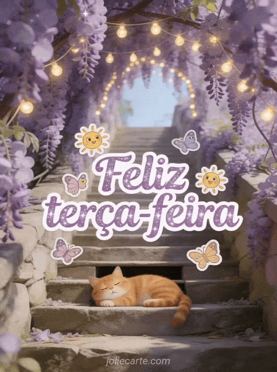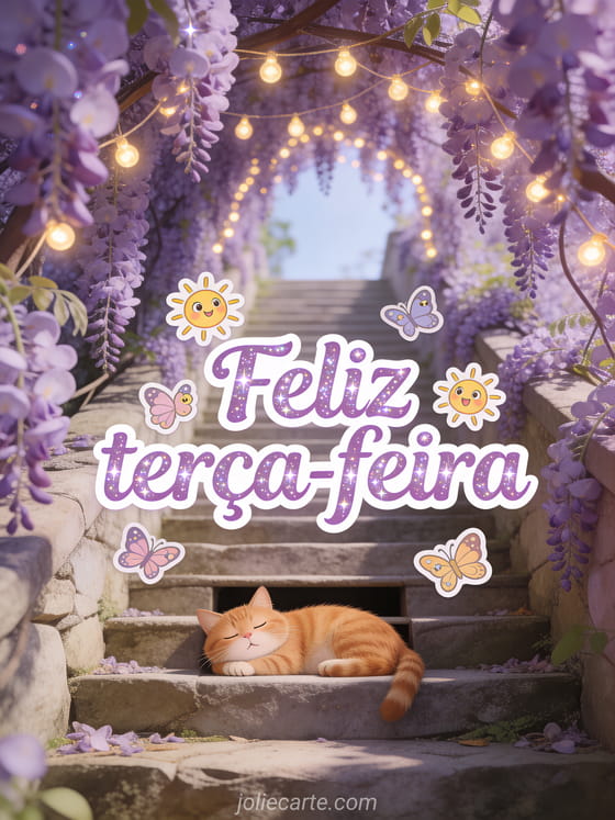Envie um cartão divertido de feliz terça-feira com letras violetas brincalhonas, pequenos sóis, borboletas travessas e escadas de pedra cobertas por glicínia lilás em cascata, bloqueadas por um gato ruivo dormindo com expressão feliz. Veja também feliz terça-feira cartão virtual, bom dia feliz terça-feira imagem ou feliz terça-feira cartão.