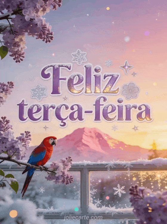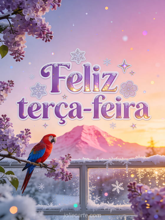 Envie um cartão mágico de feliz terça-feira com letras lilás, reflexos gelados, flocos delicados e estrelas congeladas, com uma montanha rosa ao pôr do sol, gelo brilhante no vidro e uma arara vermelha e azul pousada em um galho de lilás florido. Veja também feliz terça-feira gato imagem, feliz terça-feira sol imagem ou feliz terça-feira paisagem imagem.