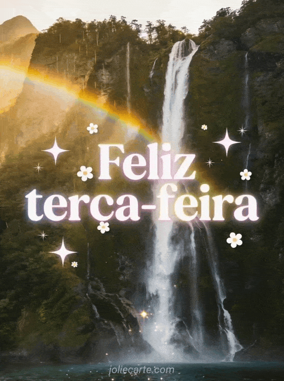 Envie um cartão de feliz terça-feira com letras brancas luminosas, estrelas brilhantes e pequenas flores brancas sobre as cachoeiras majestosas de Milford Sound, com penhascos verdes, chuva dourada, névoa e um arco-íris. Veja também bom dia terça-feira cartão, imagem grátis de feliz terça-feira beijos ou zen ternura citação positiva feliz terça-feira.