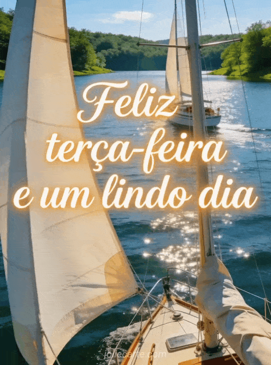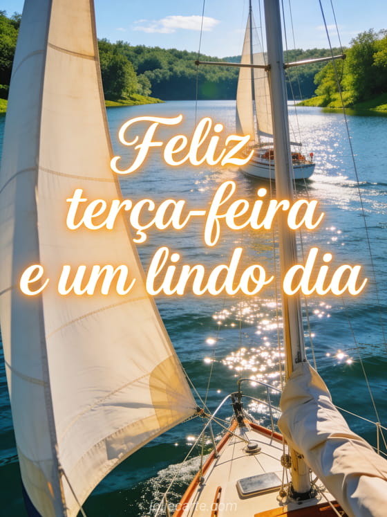 Envie uma saudação calorosa de feliz terça-feira com escrita elegante e luminosa, um veleiro em um lago brilhante sob céu claro, margens verdes e luz natural realista. Veja também este bom dia de terça-feira gif, estas feliz terça-feira beijos imagens grátis ou esta imagem de feliz terça-feira beijos.