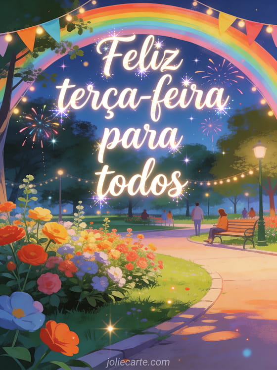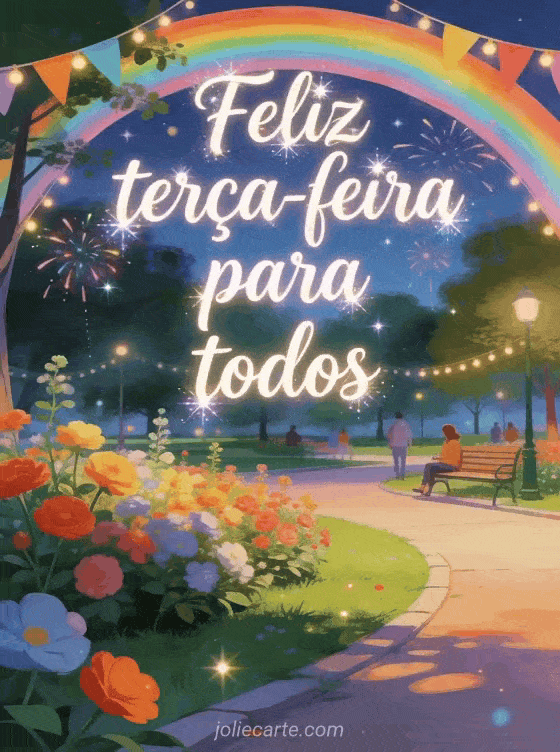 Compartilhe feliz terça-feira para todos com caligrafia fluida, uma faixa de arco-íris sobre uma cena alegre de parque, flores brilhantes e luzes de celebração. Você também pode enviar feliz terça-feira animais gif, feliz terça-feira lindas imagens animadas ou uma feliz terça-feira chuva imagem.