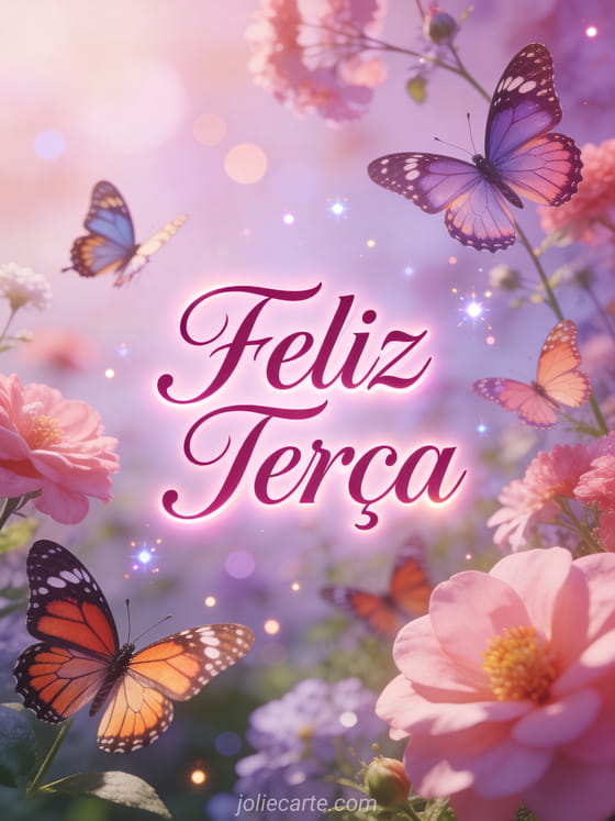 Alegre sua terça enviando este lindo cartão de feliz terça. Borboletas coloridas dançam entre flores em uma delicada atmosfera feminina com suaves tons rosa e roxo. Descubra também um cartão de boa terça-feira ou um cartão de saudação de boa terça-feira.