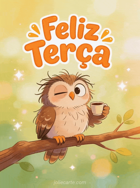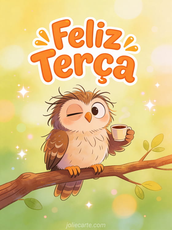 Comece sua terça com uma risada enviando este divertido cartão. Uma coruja com penas bagunçadas segura uma xícara de café com uma expressão sonolenta muito cômica. Descubra também um cartão de bom dia ou um cartão de feliz terça.