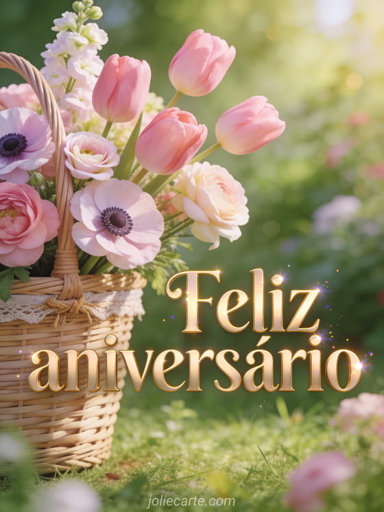 Compartilhe um cartão elegante de aniversário com tulipas rosas, anêmonas e lisianthus em cesta de vime com fundo de jardim luminoso. Você também pode ver imagem feliz aniversário com flores, feliz aniversário musical e cartões falantes feliz aniversário.