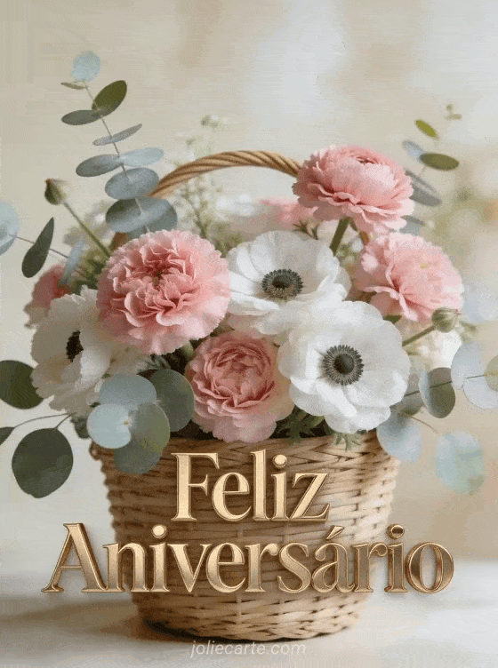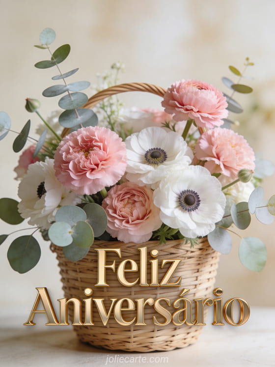 Celebre uma mulher especial com este cartao fotorrealista de aniversário com elegantes letras douradas e uma composição floral luxuosa com ranúnculos rosas, anêmonas brancas e eucalipto em uma cesta de vime. Descubra também um gif grátis de aniversário para mulher ou um gif grátis de aniversário para mulher.