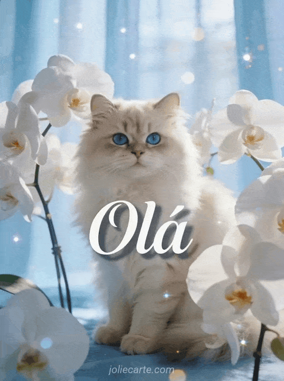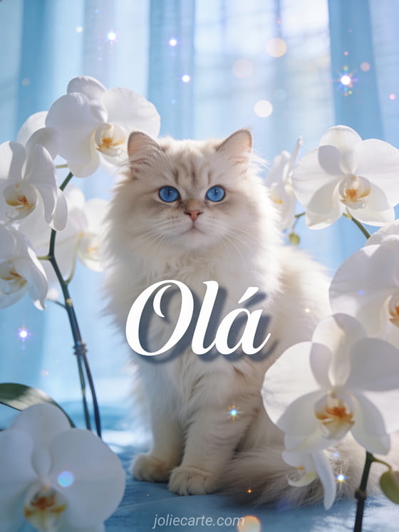 Envie este elegante olá com um gato persa fofo sentado entre orquídeas brancas na suave luz da manhã. Descubra também um cartão olá como vai você ou um cartão de bom dia.