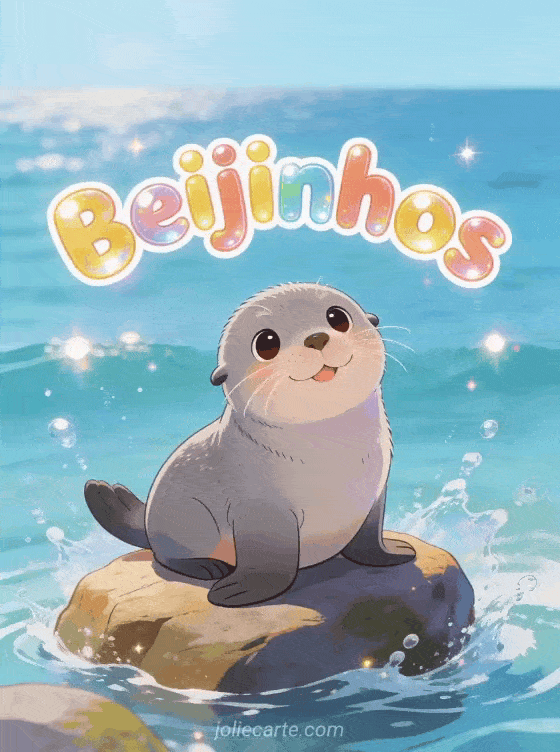 Envie beijinhos alegres com este encantador cartão com uma adorável foca cinza pousada numa rocha à beira-mar. Descubra também cartão muitos beijos ou beijinhos ternos animados.