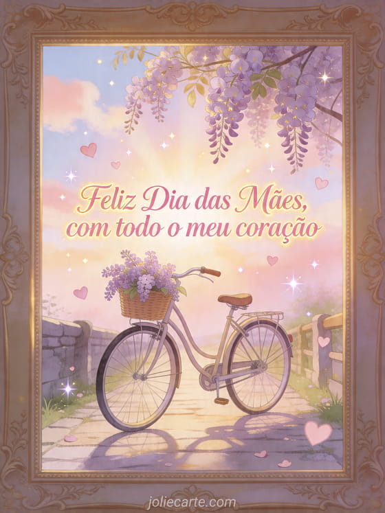 Compartilhe um cartão alegre de Dia das Mães com uma rua charmosa de vilarejo, uma bicicleta vintage, lilases perfumados e pequenos corações flutuando. Veja também poemas Dia das Mães, versos para o Dia das Mães ou flor para o Dia das Mães.