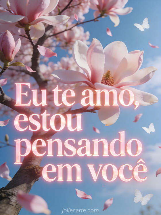 Envie este romĂąntico cartĂŁo com as palavras Eu te amo, estou pensando em vocĂȘ escritas em letras rosas luminosas, com uma magnĂłlia em plena floração e pĂ©talas rosa pĂĄlido caindo como chuva suave sob um cĂ©u azul primaveril. Descubra tambĂ©m um cartĂŁo imagens pensando em vocĂȘ beijos ou uma imagem romĂąntica pensando em vocĂȘ.