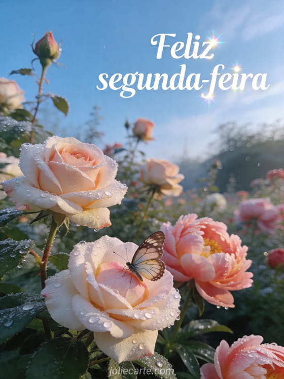 Envie uma fresca mensagem de feliz segunda-feira com este cartão fotorrealista de jardim com rosas, peônias e uma borboleta entre o orvalho da manhã. Você também pode descobrir imagem para dizer boa segunda-feira, cartão bom dia segunda-feira ou mensagem boa segunda-feira e boa semana citação.