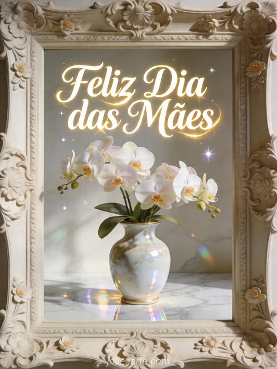 Compartilhe um cartão refinado de Dia das Mães com um vaso de porcelana, orquídeas radiantes, reflexos de mármore e um brilho festivo gracioso. Veja também um desenho para o Dia das Mães, feliz Dia das Mães cartão ou fotografias do Dia das Mães.
