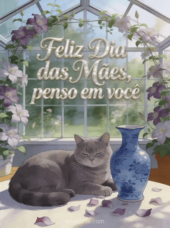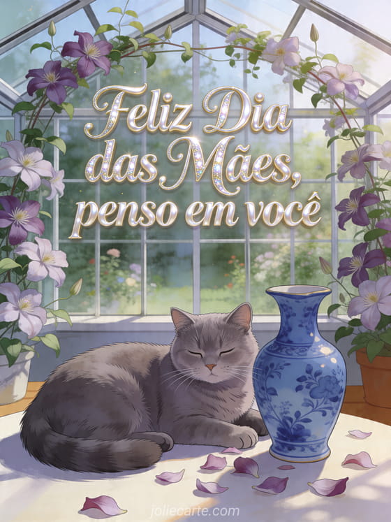Compartilhe fotografias para o Dia das Mães com uma cena realista de estufa, clematite trepadeira, um gato chartreux, um vaso azul de porcelana, pétalas espalhadas e luz natural acolhedora. Veja também cartões para o Dia das Mães, feliz Dia das Mães para minha mamãe ou poema curto para o Dia das Mães.