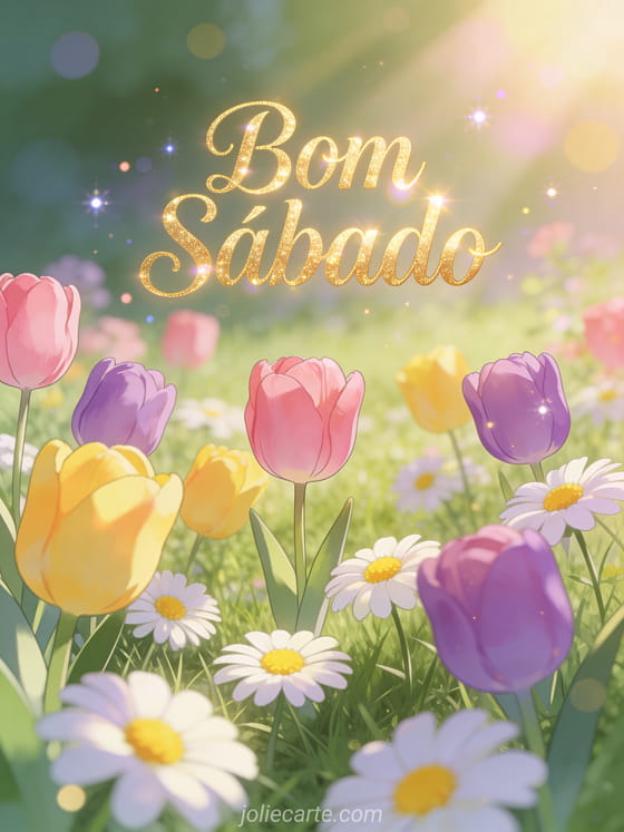 Compartilhe um alegre desejo de bom sábado com este lindo cartão com coloridas tulipas e margaridas em um jardim de primavera. Descubra também feliz sábado chuvoso ou um feliz sábado para mais inspiração de sábado.