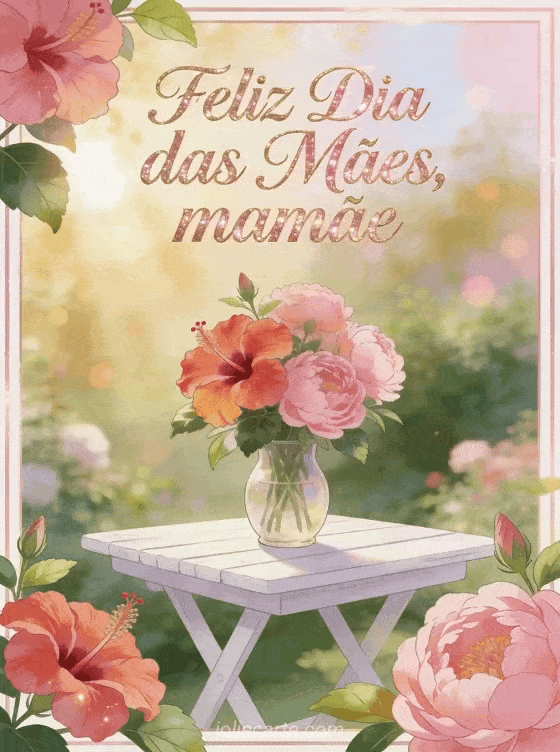 Encante sua mamãe com este lindo cartão de jardim primaveril com hibisco e peônias rosas na luz dourada. Veja também cartões dia das mães ou imagens para o dia das mães.