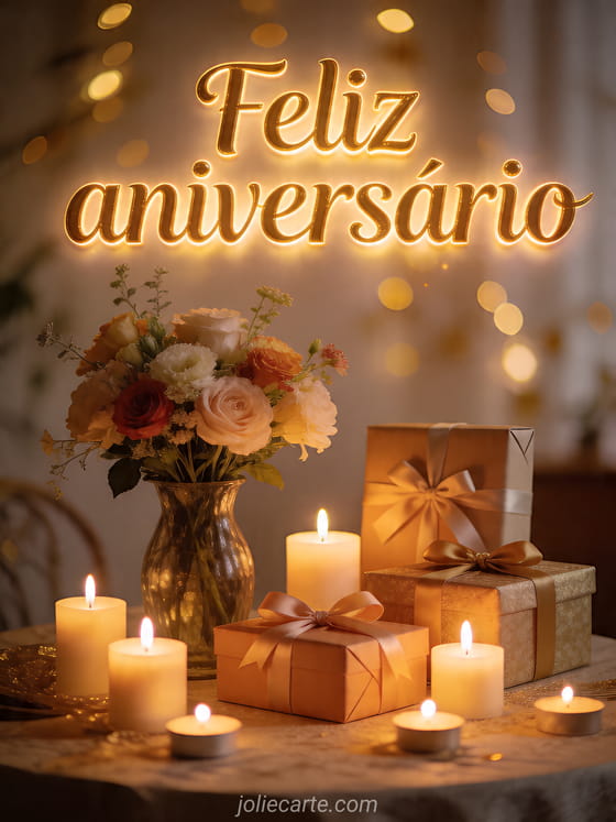 Celebre um dia especial com este cartão de aniversário caloroso e festivo com velas, flores e presentes. Veja também feliz aniversário, sms de feliz aniversário ou feliz aniversário jardineiro.
