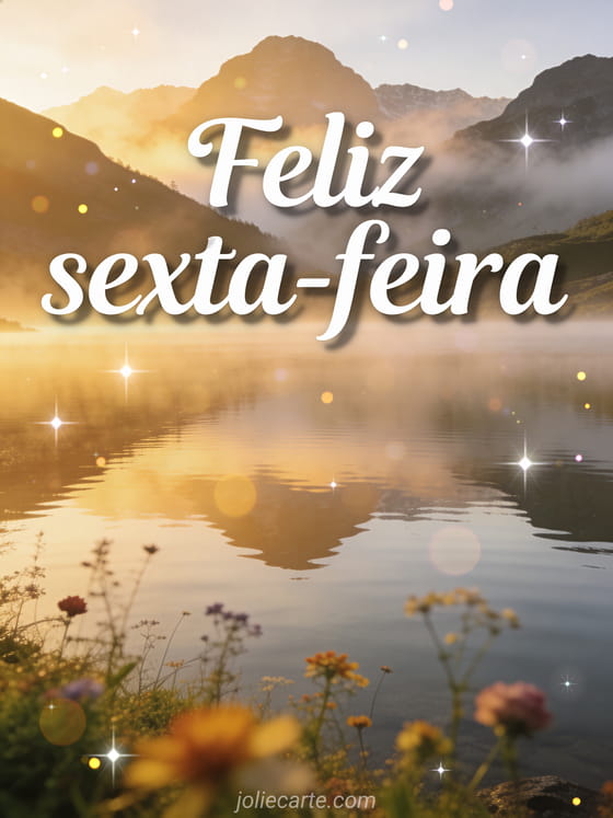 Compartilhe uma frase tranquila de feliz sexta-feira com um lago de montanha sereno ao nascer do sol, reflexos como espelho, flores silvestres e picos com névoa. Veja também feliz sexta-feira imagens gratuitas, uma mensagem para desejar boa sexta-feira ou feliz sexta-feira muitos beijos.