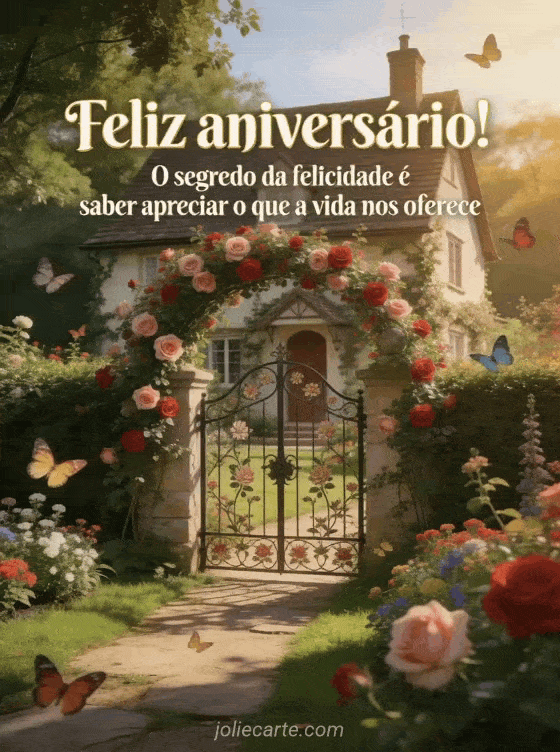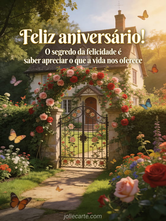 Comemore com uma frase original de aniversário neste cartão vintage elegante, com cottage inglês coberto de rosas, jardim exuberante, borboletas e luz dourada da tarde. Você também pode ver cartão de aniversário virtual original grátis, cartão de aniversário original e cartão de aniversário virtual original.