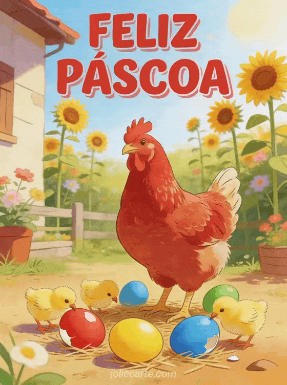 Comemore a Páscoa com este cartão virtual fofo de uma galinha ruiva rodeada de pintinhos amarelos e ovos de Páscoa coloridos num galinheiro ensolarado com girassóis. Descubra também uma cartão coelho de Páscoa ou uma Feliz Páscoa GIFs animados grátis.