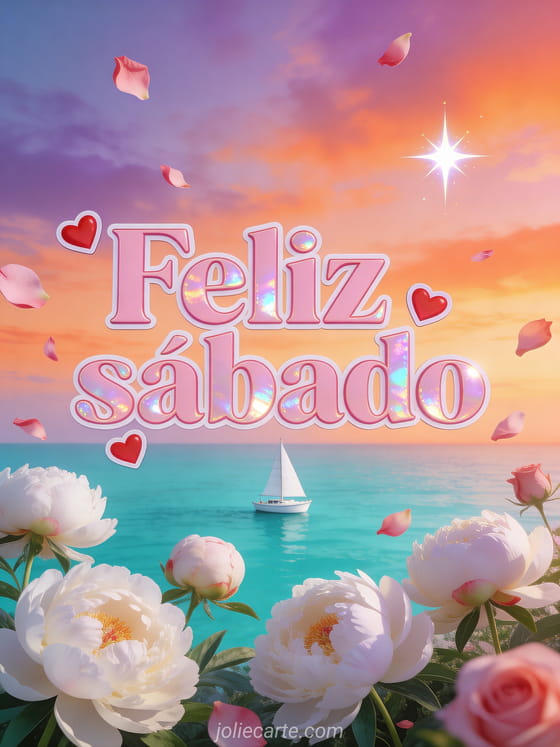 Compartilhe um cartão romântico de feliz sábado com letras rosa-pó peroladas, pequenos corações vermelhos, pétalas de rosa, uma baía turquesa ao crepúsculo, um pequeno veleiro branco navegando em paz e peônias brancas em primeiro plano sob um céu rosa, laranja e violeta. Veja também feliz sábado bom fim de semana, bom dia feliz sábado gifs animados ou feliz sábado carinha.