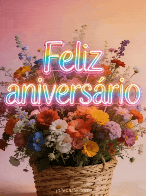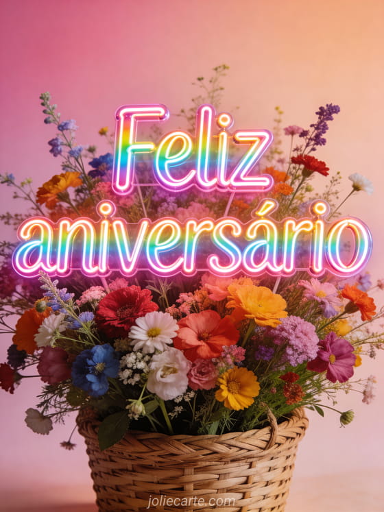 Felicite uma mulher especial com este cartão animado espetacular com letras neon arco-íris e um buquê de flores silvestres multicoloridas numa cesta de vime sobre fundo degradê rosa e pêssego. Elegante e chamativo. Descubra também um cartão aniversário mulher com cachorro ou imagens engraçadas aniversário mulher.
