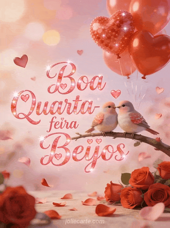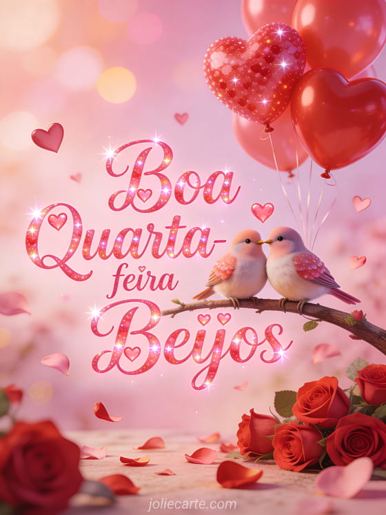 Compartilhe doces beijos de quarta-feira com este romântico cartão com dois inseparáveis em um galho rodeados de balões em forma de coração e pétalas de rosa. Descubra também bom dia para quarta-feira ou bom dia boa quarta-feira zen para mais inspiração.