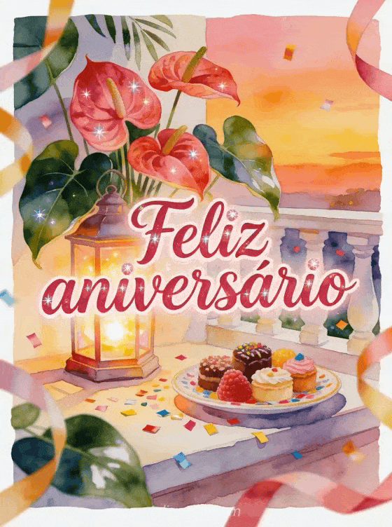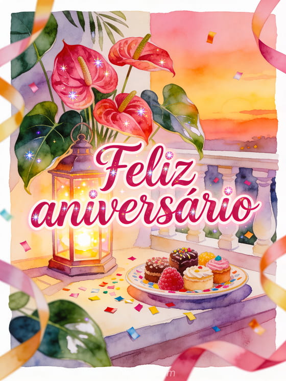 Compartilhe uma mensagem brilhante de aniversário com caligrafia framboesa, flores de antúrio, uma lanterna acesa e doces em um terraço festivo. Veja também um feliz aniversário mãe texto simples, um feliz aniversário sogra texto ou um cartão feliz aniversário mamãe grátis.
