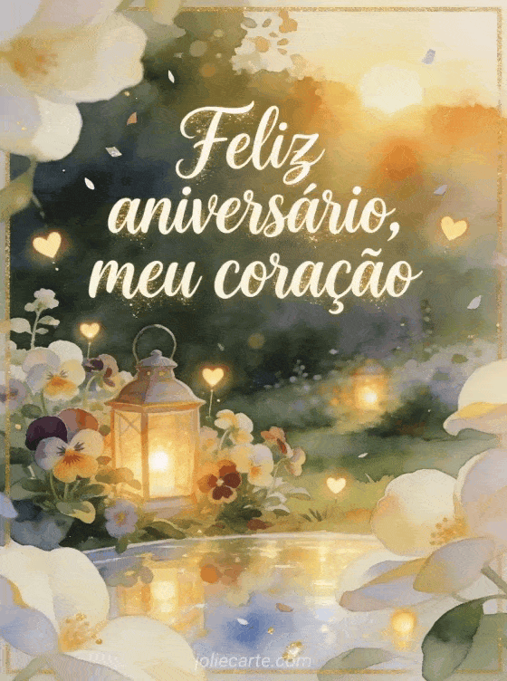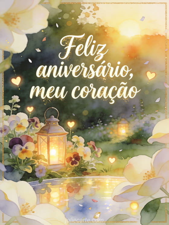 Compartilhe uma saudação luminosa de aniversário para seu coração com este cartão de jardim em aquarela, onde lanternas, amores-perfeitos, luzes de coração flutuantes e brilho dourado criam um amanhecer romântico. Personalize online e envie grátis em segundos. Veja também mensagens de aniversário para meu amor, um cartão animado feliz aniversário meu amor ou um cartão aniversário meu amor.